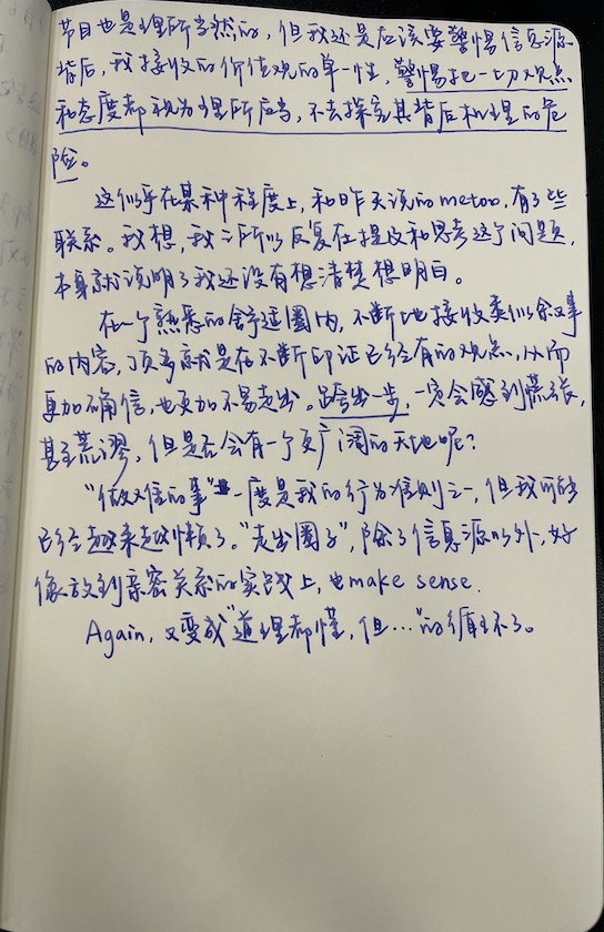 我和她最近的交流一直围绕着焦虑的话题,虽然我们都出生在一二线城市,不算是字面意义上的小镇做题家,但或许我们都算得上广义的“东亚做题家”,成长在同侪竞争激烈的东亚社会,从小就在家人的指导(可能是强制)下规划人生,又都挺擅长考试,所以进入了国内TOP2,实习工作也都在big name,看起来延续着小时候“别人家的孩子”的生活状态。事实上我们生活圈中的大多数朋友都是类似的道路类似的状态,完美主义、追求极致的个性帮助我们收获了不少,但同时也把我们带入了永不满足、停不下来的焦虑中。于我自身而言,我比她意识到这个问题要早一些,18年我遭遇了现在被我视为存在主义危机的时期,回看当时的我,在和咨询师的交流中反复触及这个话题,从那以后我开始调节,放慢脚步,让自己心安理得地接受舒适的状态,一开始并不是那么习惯,现在也依然会因为懒惰、无所事事、一段时间内没有进步而焦虑。而最近,她老公裸辞以后一直在家,虽然他们的家境和她自己的工资完全可以支撑他们两人的物质生活,但她反复和我提起她对于呆废了的恐惧以及由此催生出的他俩的争吵。她说现在她的每次出差对她来说反而成了解脱,所以她最近约我见面的频率明显高了许多,才会有昨天这样的多番邀请。
